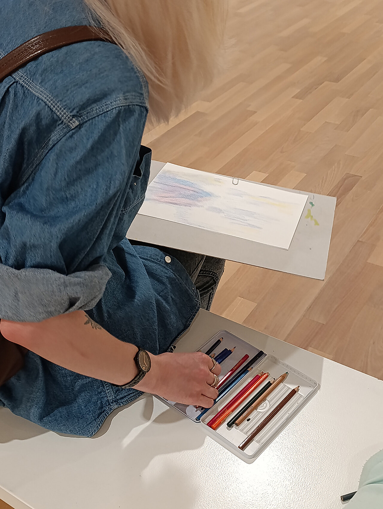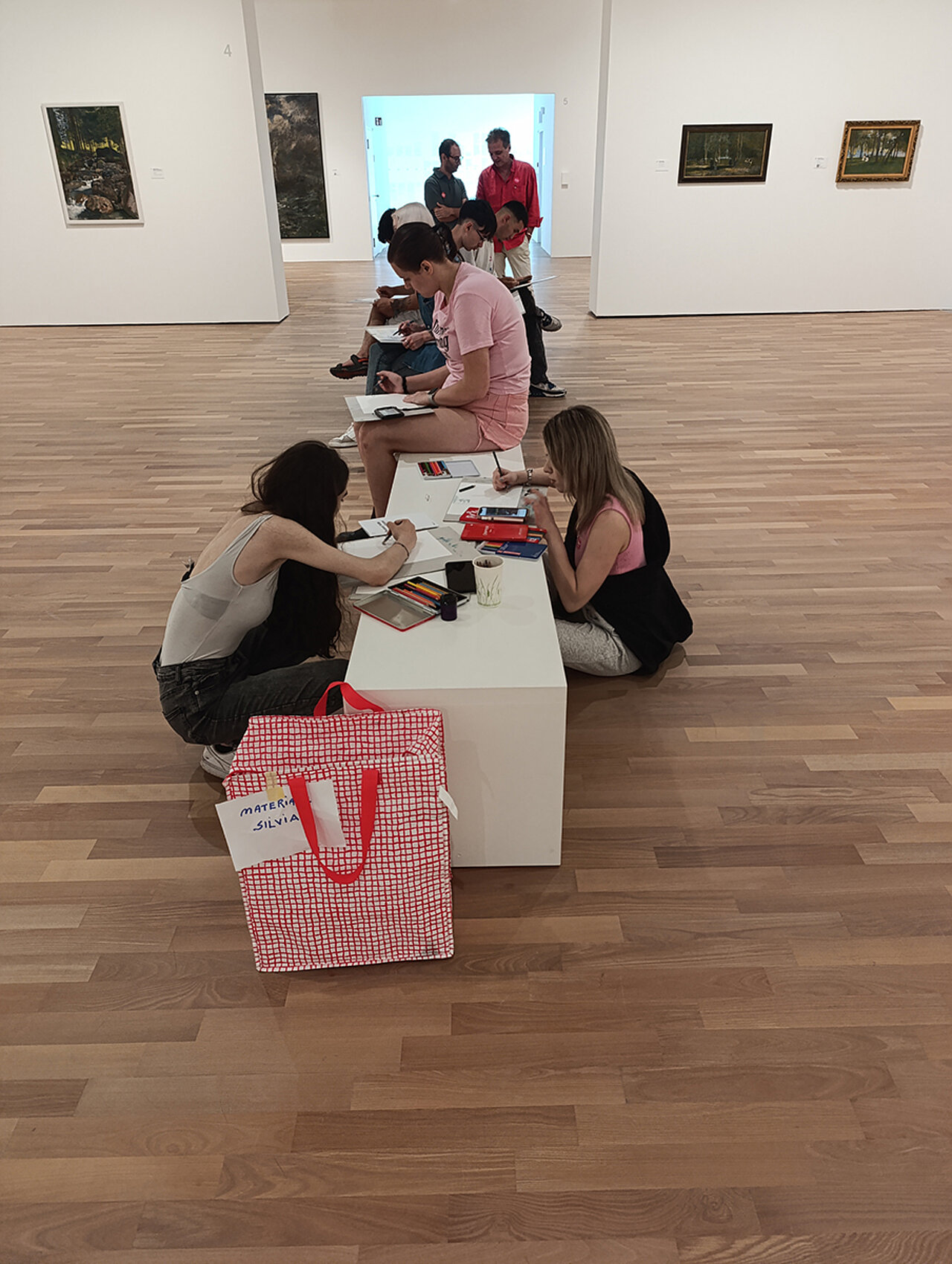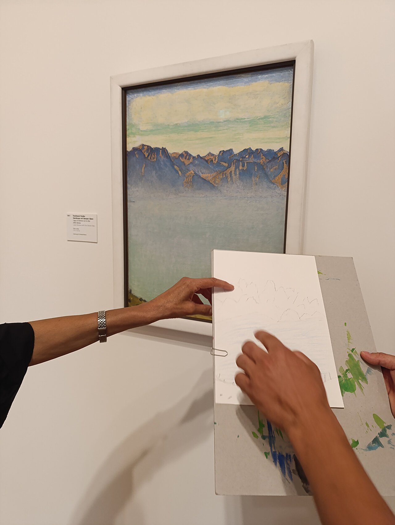 Nello specifico, si è partecipato agli atelier “Il Frammento” e “Io e l’albero”. Nel primo, le persone in formazione potevano immergersi totalmente ed osservare da vicino le tecniche di rappresentazione di piccoli dettagli. Una foglia, una nuvola, una mano, un occhio, un sasso, una montagna… Frammenti in cui percepire tutta la poesia, il simbolismo e l’intensità del pittore. Dopo aver osservato i quadri in mostra, hanno ridisegnato uno di questi elementi andando oltre la rappresentazione realistica per riflettere intorno ai temi eterni e ricorrenti del destino umano. Nel secondo, invece, dopo aver ammirato i quadri di Holder e Franzoni si scopre la valenza simbolica che ciascun albero può avere e in atelier ogni partecipante ha dovuto disegnarsi “come se fosse un albero”.